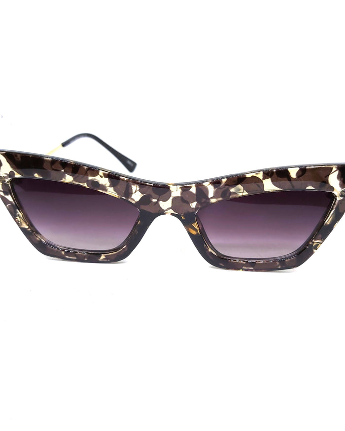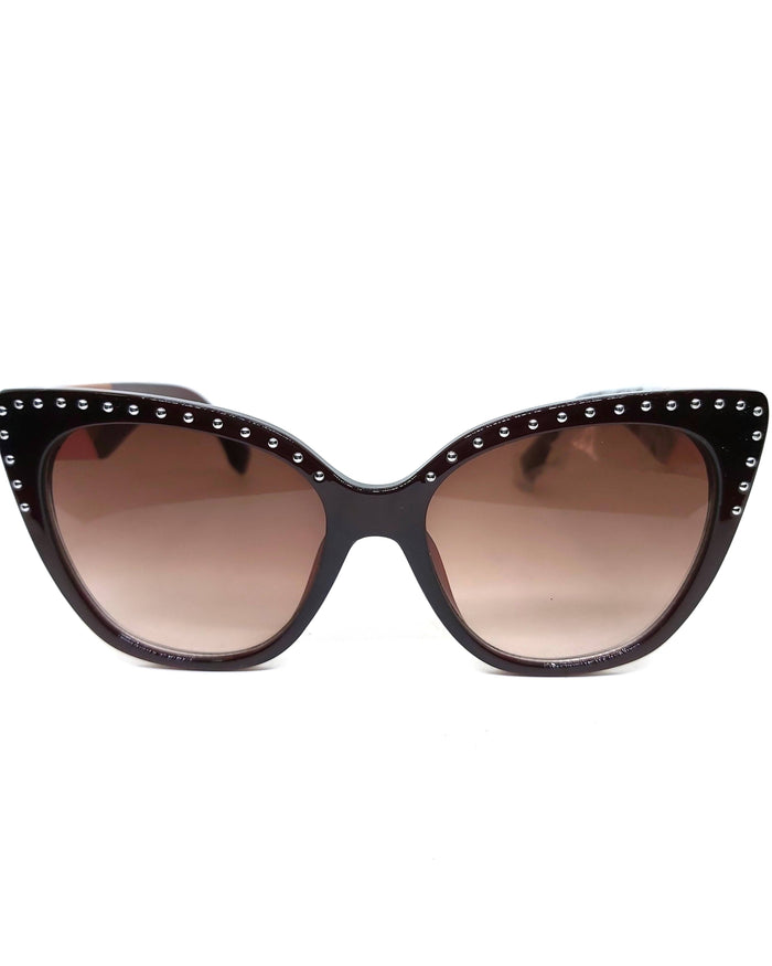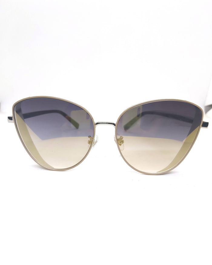 Shape: Cat eye Frame material: Metal Frame color: Silver Lens material: Glass Lens color: Gray Sand Looks best on these face shapes: Oval, Round