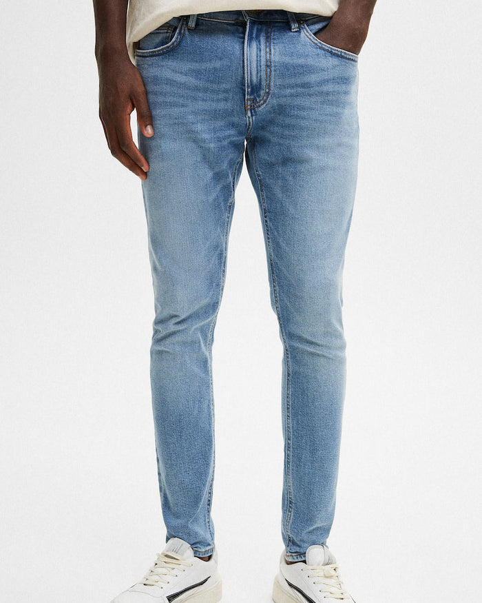 Super skinny jeans in a medium blue wash with a five-pocket design, belt loops, and zip fly and top button...