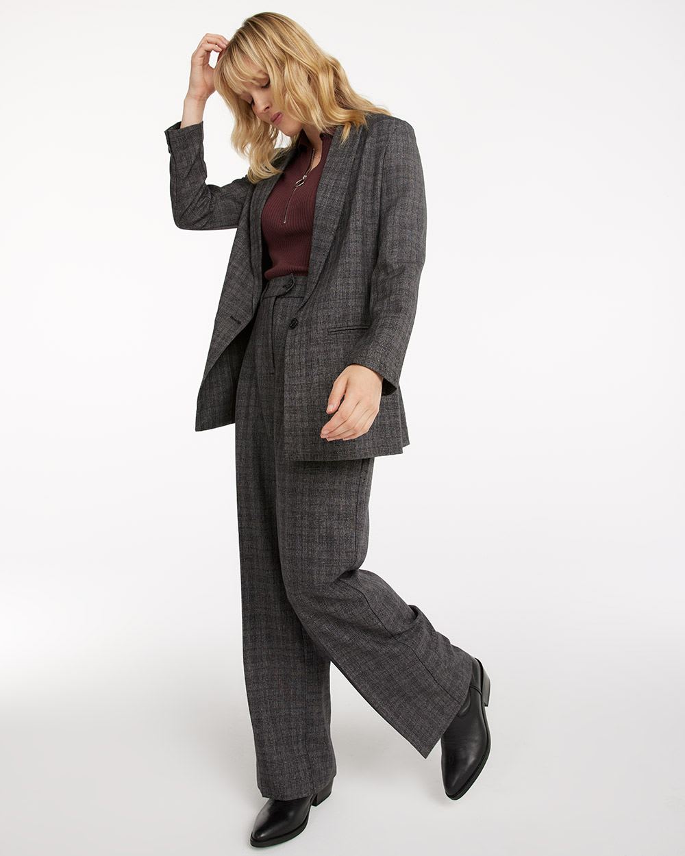 - Stretch woven fabric - All-over plaid pattern - Unlined - Loose fit - Tailored collar - Long sleeves - One-button front closure - Functional welt pockets at front - Vent at back - Long length