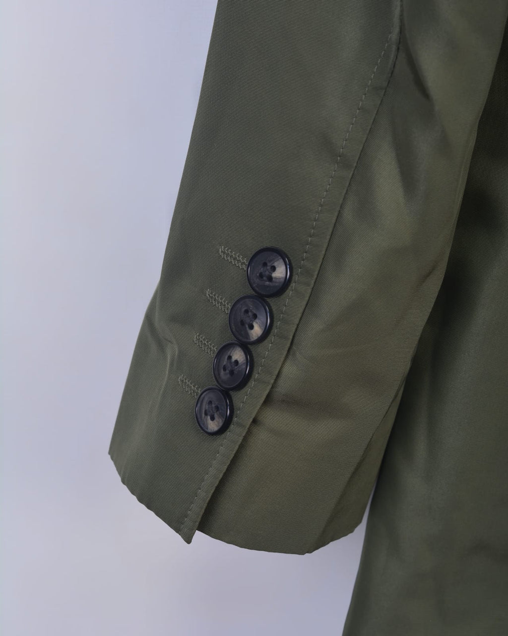 Olive-green solid single-breasted trench coat, has notched lapel, double button closures, long sleeves with roll-up tabs, and two pockets