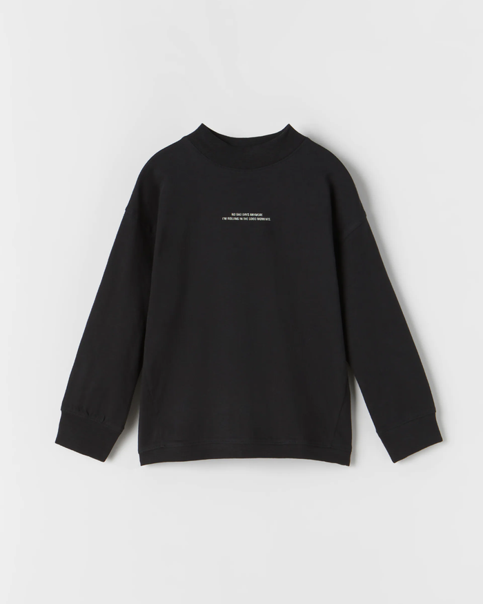 HIGH COLLAR TOP WITH LONG SLEEVES. TONAL TEXT PRINT AT CHEST. CONTENTS AND CARE JOIN LIFE Care for water: produced...