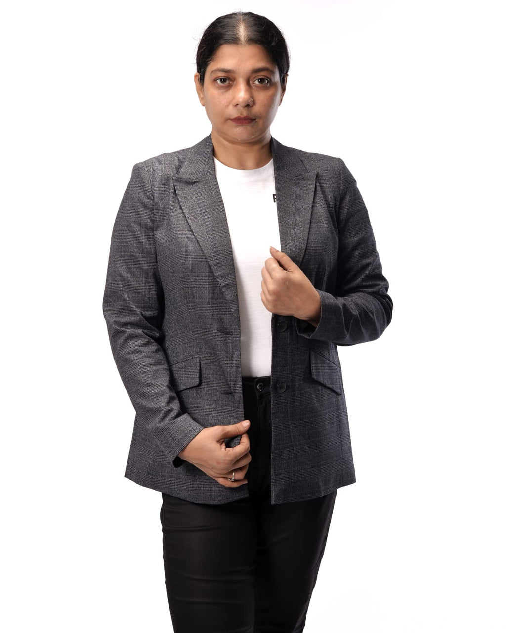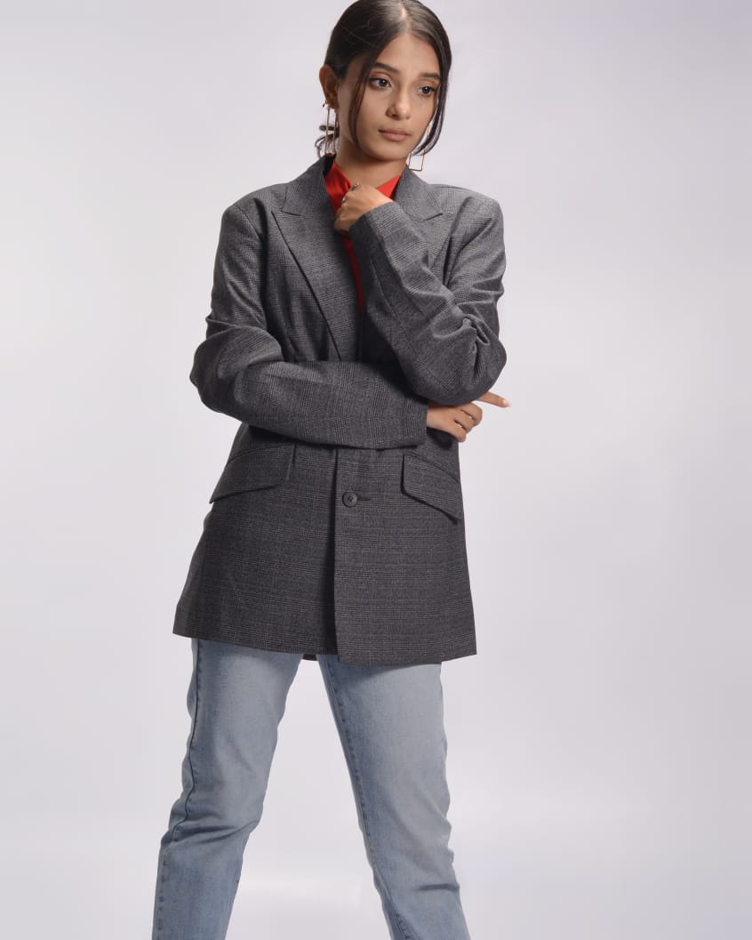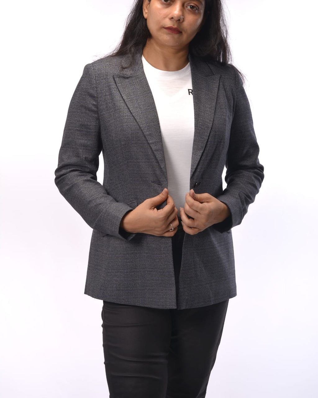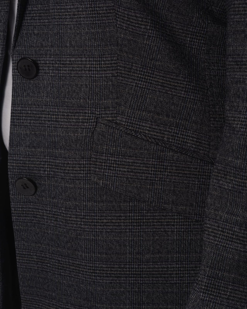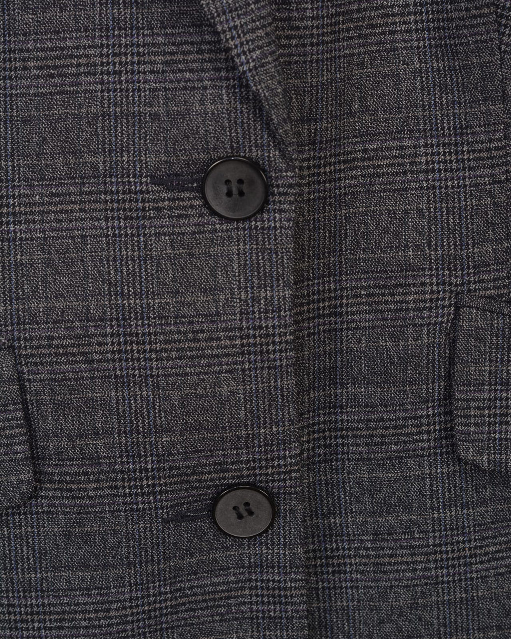 In a charcoal check design this blazer is a structured fit featuring flap pockets and a single button closure.