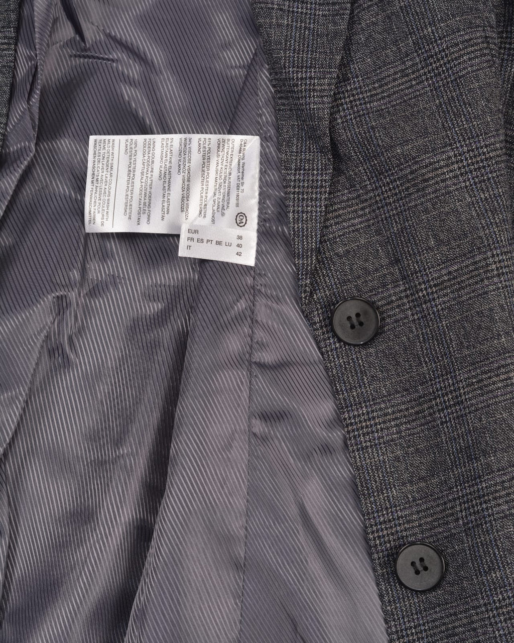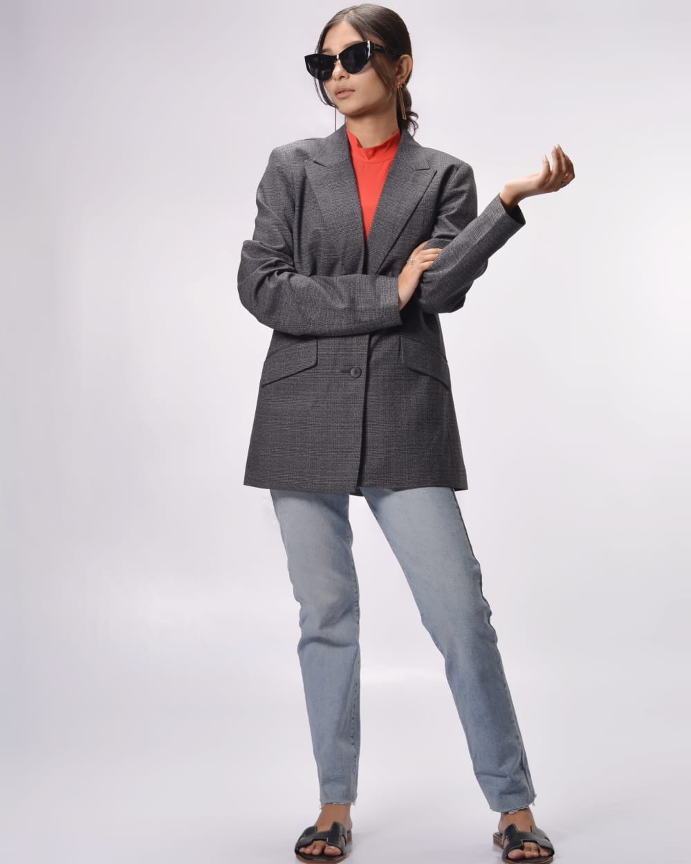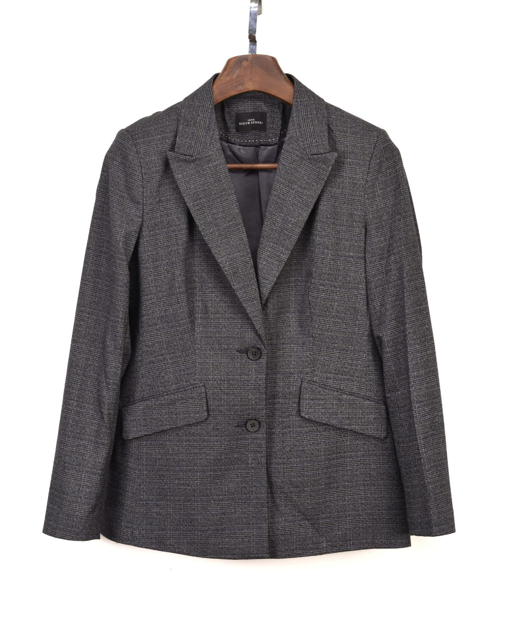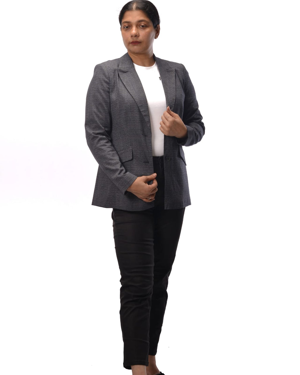 In a charcoal check design this blazer is a structured fit featuring flap pockets and a single button closure.
