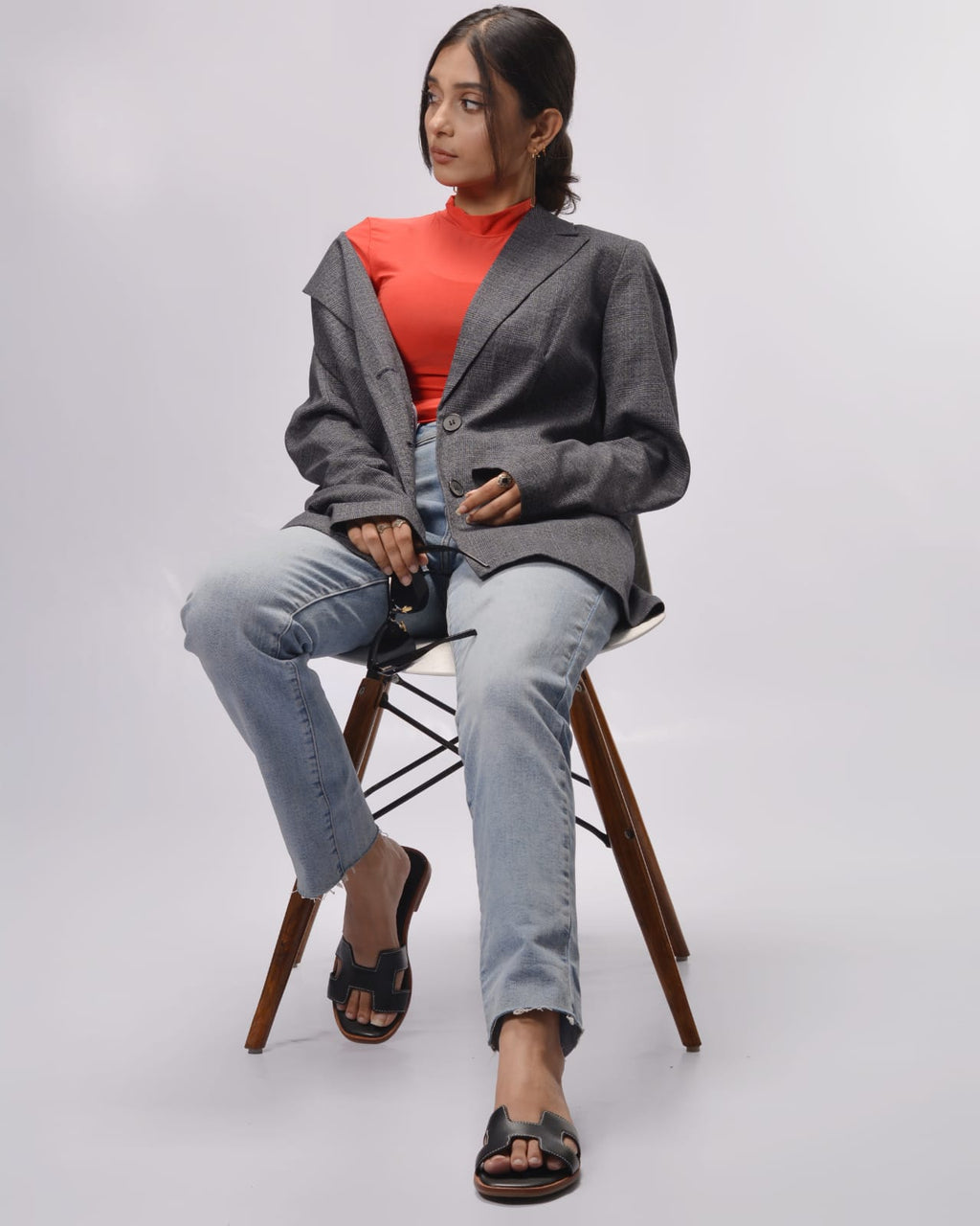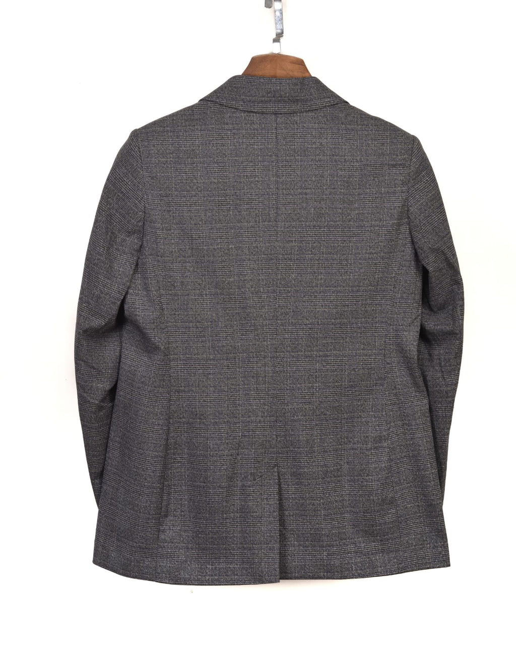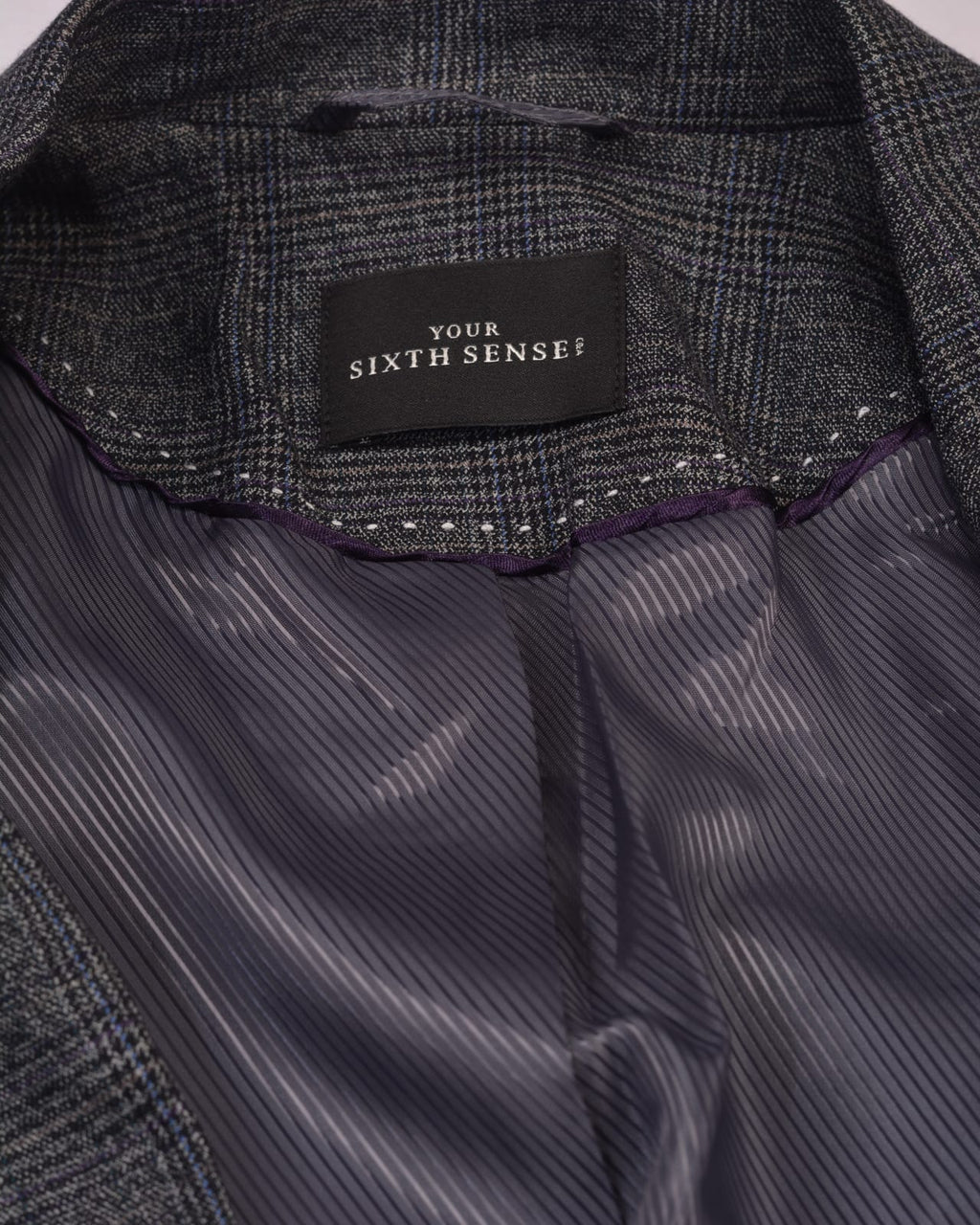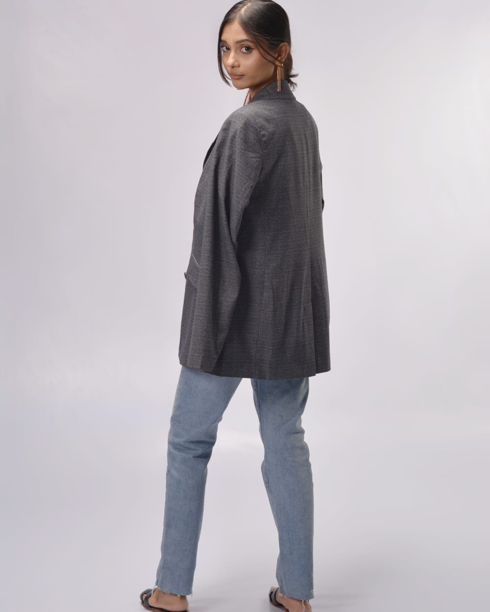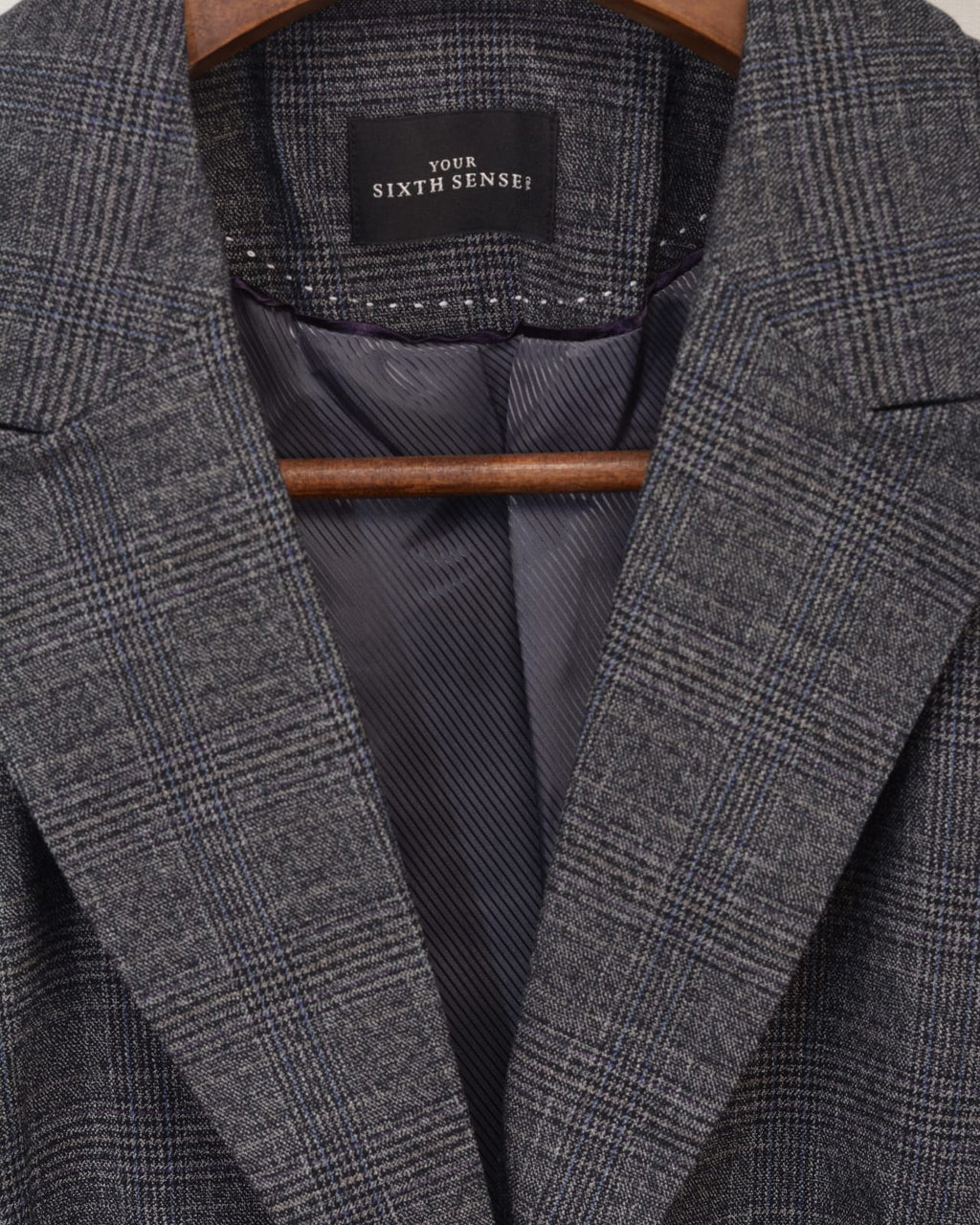 In a charcoal check design this blazer is a structured fit featuring flap pockets and a single button closure.